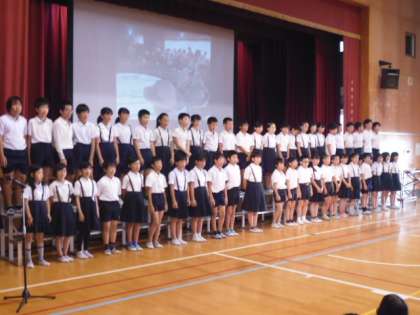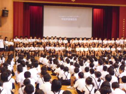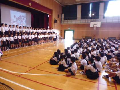 今日の児童集会は6年生による平和学習報告集会でした。6月の修学旅行の前から、6年生は平和について、様々な取り組みを積み重ねてきました。今日は、修学旅行の体験やそこから考えた平和の大切さについて、感想を述べたり、詩の群読をしたり、「命」という歌を歌ったりして、報告をしてくれました。6年生の子どもたちの心が伝わった内容でした。