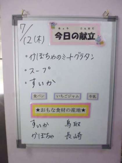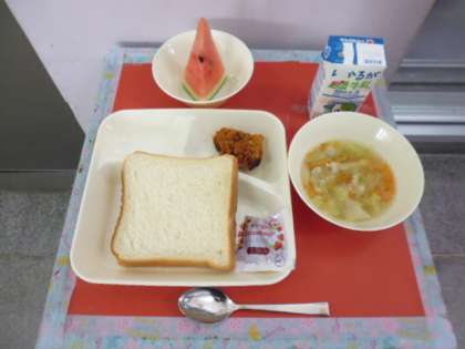 ★7月11日(木)の給食は、 ・かぼちゃのミートグラタン ・スープ ・すいか ・食パン ・いちごジャム ・牛乳です。