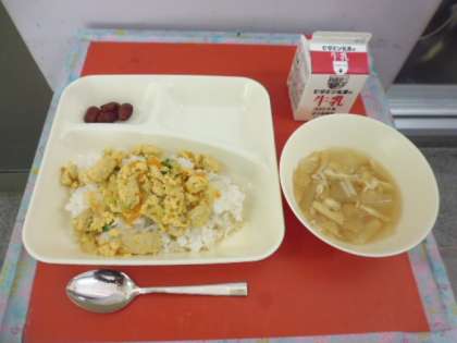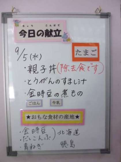 ★9月5日(水)の給食は、 ・親子丼 ・とうがんのすまし汁 ・金時豆の煮もの ・ごはん ・牛乳です。