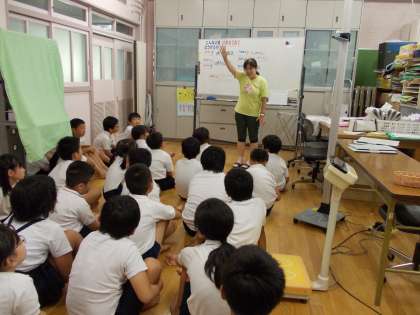 2学期の発育測定のあとの保健指導は、運動会にむけて、安全に過ごせるよう「水分補給の注意」「汗のしまつ」「けがの予防と手当て」の3つのお話をしました。