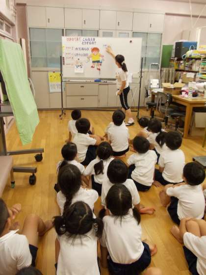 低学年は、擦り傷、切り傷、打撲、鼻血などの時に、まず自分でできる応急処置を「けがをしたタロウ君人形」といっしょに覚えました。