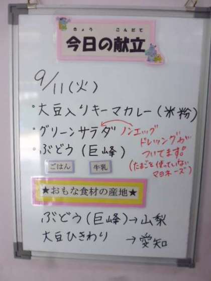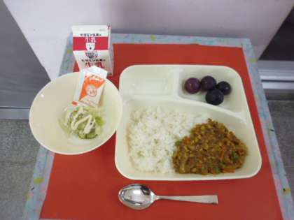 ★9月11日(火)の給食は、 ・大豆入りキーマカレー(米粉) ・グリーンサラダ(ノンエッグドレッシング) ・ぶどう(巨峰) ・牛乳です。