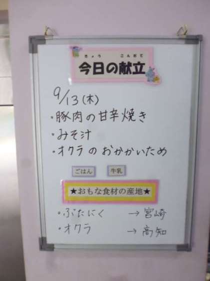 ★9月13日(木)の給食は、 ・豚肉の甘辛焼き ・みそ汁 ・オクラのおかかいため ・ごはん ・牛乳です。