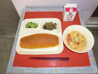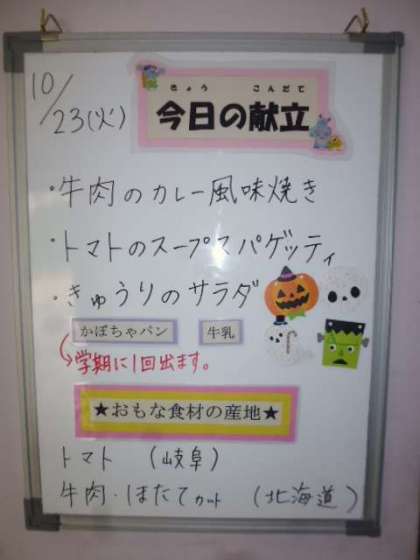 ★10月23日(火)の給食は、 ・牛肉のカレー風味焼き ・トマトのスープスパゲッティ ・きゅうりのサラダ ・パンプキンパン(学期に1回登場します。) ・牛乳です。