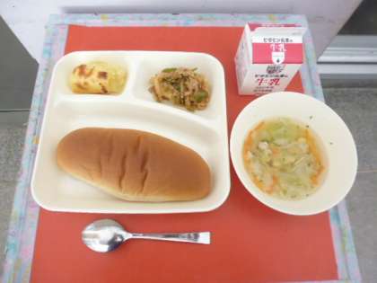 ★10月25日(木)の給食は、 ・豚肉と野菜のケチャップソテー ・スープ ・スイートポテト ・黒糖パン ・牛乳です。