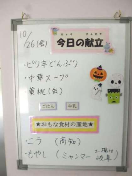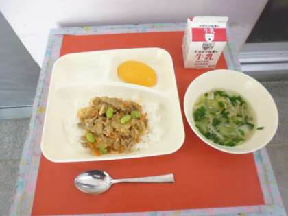 ★10月26日(金)の給食は、  ・ピリ辛丼  ・中華スープ  ・黄桃(缶)  ・牛乳です。