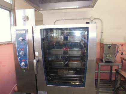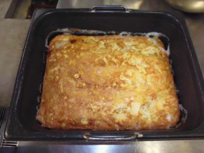 今日の給食のツナポテトオムレツは、鶏卵に塩・こしょうで味付けし、ツナ(油漬缶フレーク)、ゆでたじゃがいもをいれて焼き物機で焼いています。都島小学校で使用している焼き物機では、一回で全クラス分を焼くことができます。とてもおいしそうに焼き上がりました。
