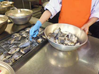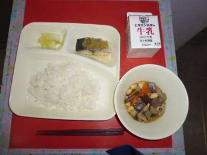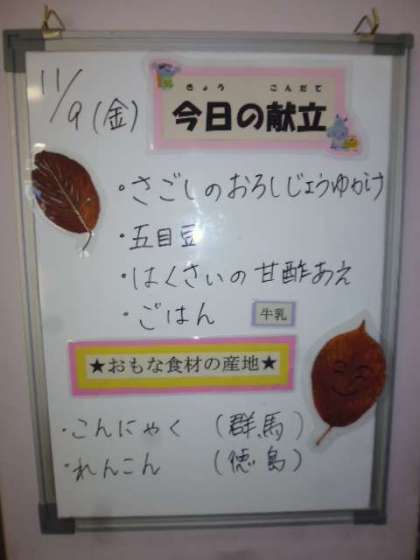 ★11月9日(金)の給食は、 ・さごしのおろしじょうゆかけ ・五目豆 ・はくさいの甘酢あえ ・ごはん ・牛乳