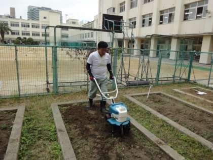 今年度、校長戦略予算(加配)で購入した耕うん機です。早速管理作業員の細田さんに学習園の整備をお願いしました。