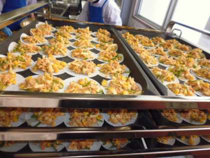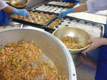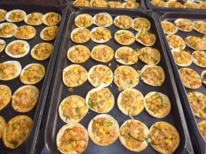 給食にでるピザには、ツナ(缶)、コーン、ピーマン、ピザソース、チーズを混ぜたものをギョーザの皮の上にのせて焼き物機で焼いています。児童に人気の献立です。とてもいい色に焼きあがりました。