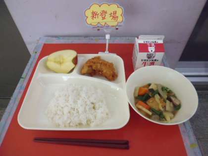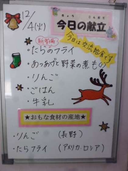 ★12月4日(火)の給食は、 ・たらのフライ(新商品です!) ・あつあげと野菜の煮もの ・りんご ・ごはん ・牛乳