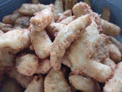 たらのフライに使われているスケトウダラは、タラ科の魚で、体長は60センチメートルくらいになります。冷凍のすり身としてかまぼこの原料にもなります。給食に出る「たらのフライ」の原材料は、スケトウダラ、パン粉、小麦粉、でんぷん、小麦たんぱく、香辛料、水です。