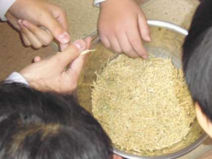 必要のない部分を子どもの手で取り、籾取りのための機械に入れて玄米にし、最後に精米しました。