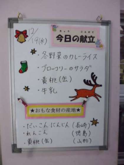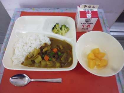 ★12月19日(水)の給食は、 ・冬野菜のカレーライス ・ブロッコリーのサラダ ・黄桃(缶) ・牛乳