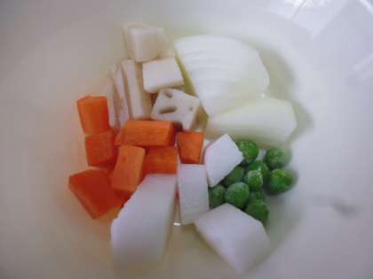 今日のカレーライスには、牛肉の他に、だいこん、れんこん、にんじん、たまねぎ、グリンピースがはいっています。