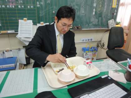 まず、毎日の給食は児童が食べる30分前に管理職が検食をして安全を確認します。その後、児童への配缶が始まります。また月に1回調理員さんや担当職員・PTAで給食の安全について話し合います。これからも「安心・安全」のためにとりくんでいきます。