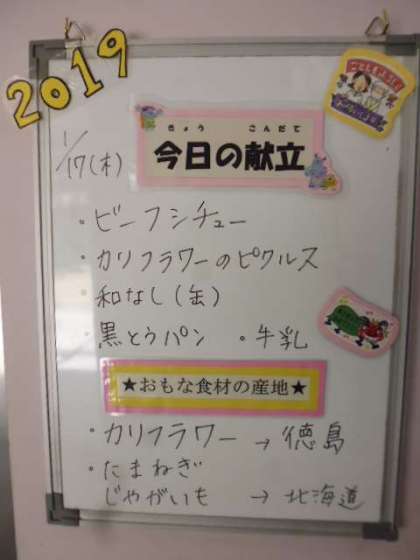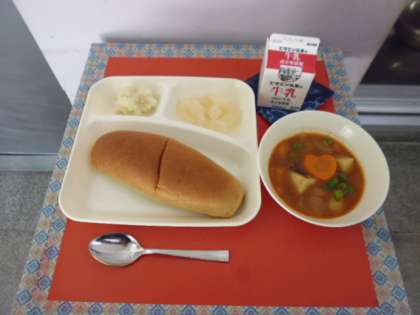 ★1月17日(木)の給食は、  ・ビーフシチュー  ・カリフラワーのピクルス  ・和なし(カット缶)  ・黒糖パン  牛乳です。