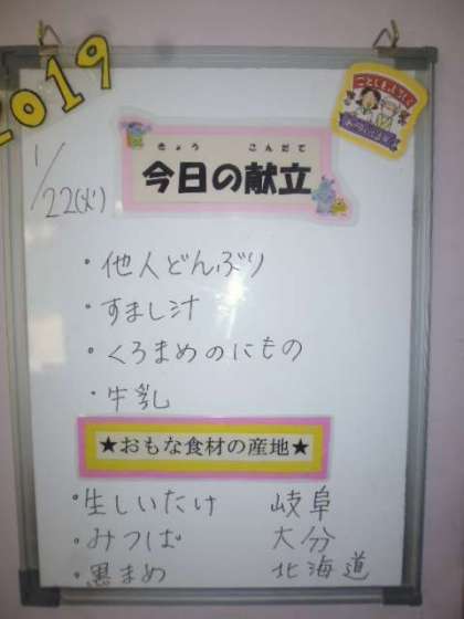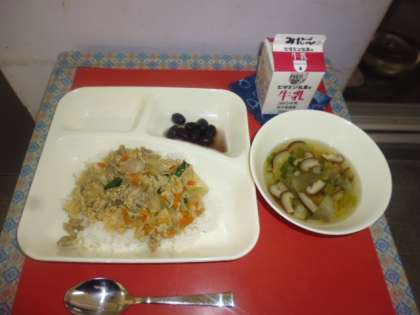 ★1月22日(火)の給食は、  ・他人丼(たまごの個別対応献立です。)  ・すまし汁  ・黒豆の煮もの  ・牛乳です。