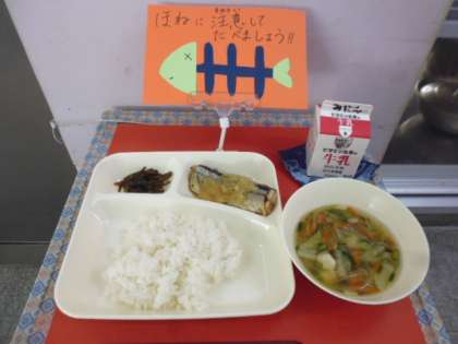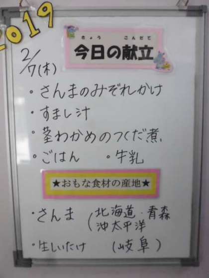 ★2月7日(木)の給食は,、 ・さんまのみぞれかけ ・すまし汁 ・茎わかめのつくだ煮 ・ごはん ・牛乳です。