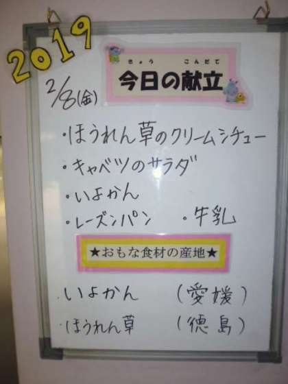 ★2月8日(金)の給食は、 ・ほうれん草のクリームシチュー ・キャベツのサラダ ・いよかん ・レーズンパン ・牛乳です。