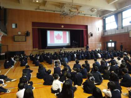 今日の児童集会は縦割り班で、クイズを楽しみました。国旗をプロジェクター映し、国名を当てます。なかなか難しく、正解すれば歓声があがっていました。