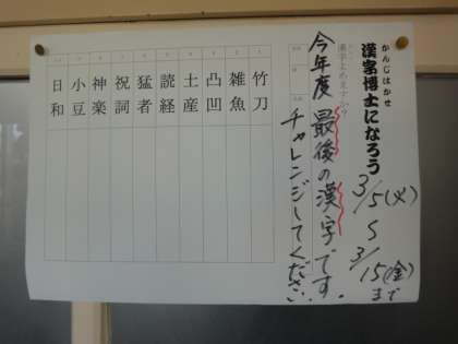 今年度最後の「漢字博士」の問題を掲示しました。この1年間、たくさんの児童が挑戦してくれました。みんなが、楽しんでいる姿を見ると本当にうれしいです。今回も、チャレンジしてくださいね。