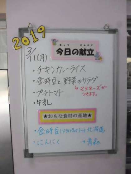 3月11日(月)の給食は、  ・チキンカレーライス  ・金時豆と野菜のサラダ(マヨネーズが1袋つきます。)  ・プチトマト  ・牛乳です。
