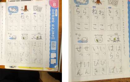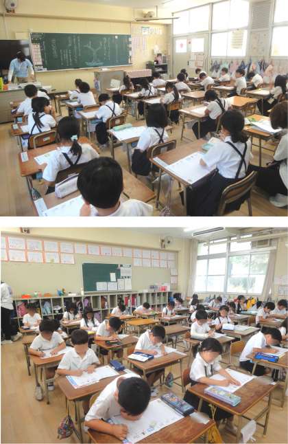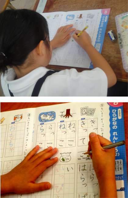 1年生の教室をのぞくと、ひらがなの学習をしていました。教室に入ってもみんな一言もお話することなく、背筋を伸ばしてとてもいい姿勢で文字の書き取りをしていました。