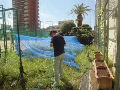 5年生が育てる稲が生長し、稲穂が垂れるようにまでなってきました。それに伴いスズメが寄ってくるようになったので、防鳥ネットを張るようにしました。