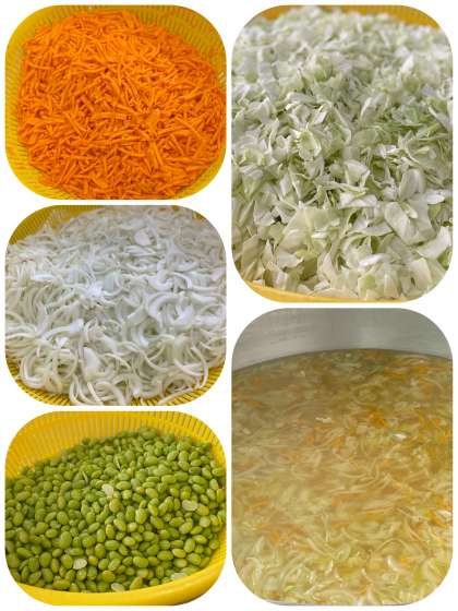 スープは、鶏肉、キャベツ、たまねぎ、にんじん、彩にむきえだまめを使用した、優しい味のスープです。