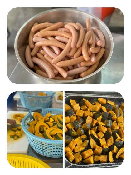 焼きかぼちゃは、大切りにした生のかぼちゃに、塩、綿実油で下味をつけて、焼き物機で蒸し焼きにしています。ほくほくと甘くておいしい一品です。