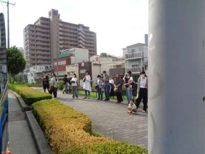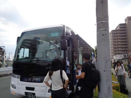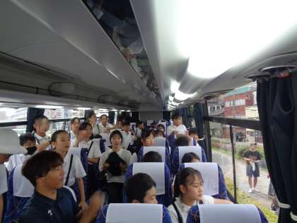 自然教室への出発です。1台のバスに5年生全員が乗り込み、お見送りのお家の人に手を振って「いってきま〜す」