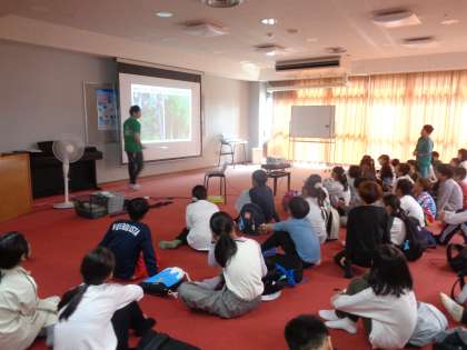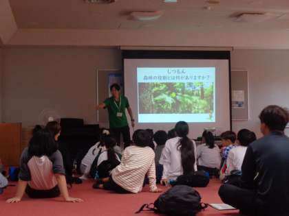 昼食後、森の役割を知り、環境保全につなげる「森林環境プログラム」を青少年自然の家のスタッフの方に実施していただきました。