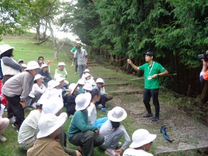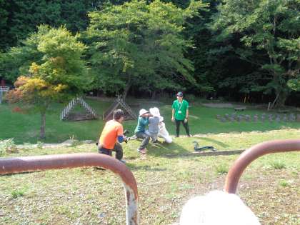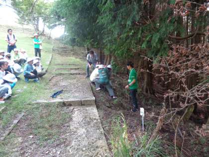 室内での学習の後、そのまま屋外に出て土の様子を検査する機械「検土杖」を使って、木の植わっていない場所と、植わっている森の中の土の様子を調べました。