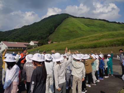 屋外での検土杖を使った検査から、宿舎に帰る途中、赤トンボがたくさん飛んでいて指を立てるととまってくるので、みんなでトンボをとまらせようと指を出しました。