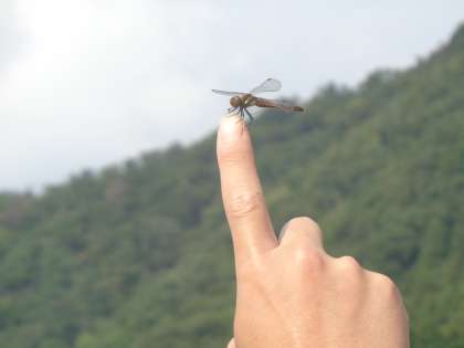 伊藤先生にとまったトンボは、よほど気に入ったのか、宿舎までずっと指から離れませんでした。