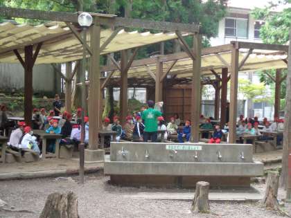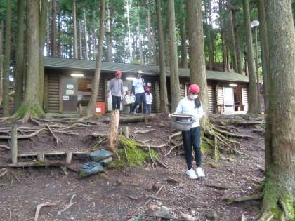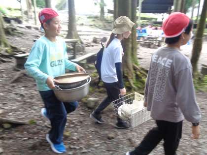 宿舎のすぐ裏手にある野外炊事場で、ちゃんこ鍋を作る活動に入りました。各活動班を、火起こし係・食材洗い係・食器洗い係に分かれて、それぞれの役割を果たしていきます。