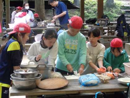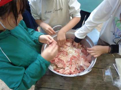 切った食材を鍋に入れ、火起こし係が待つかまどに持っていきます。