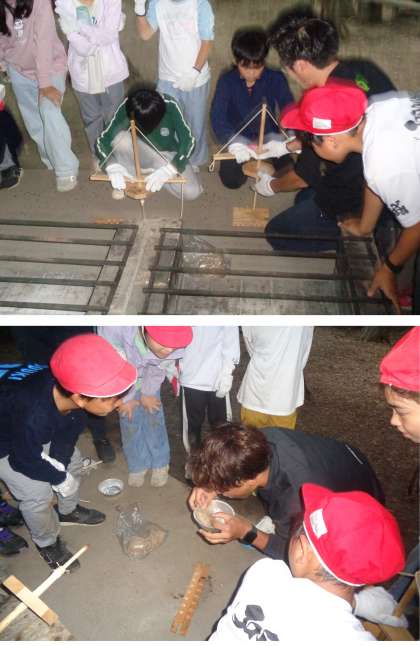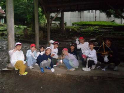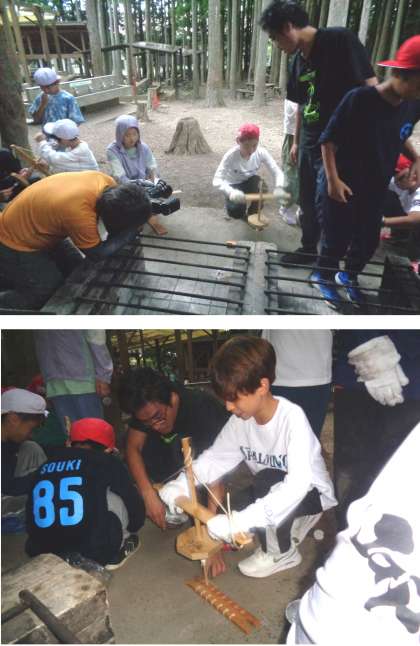 夕食までの時間を利用して、都島小学校から持ってきた火起こしの道具で、火起こし体験を野外炊事場で行いました。