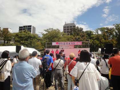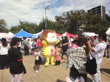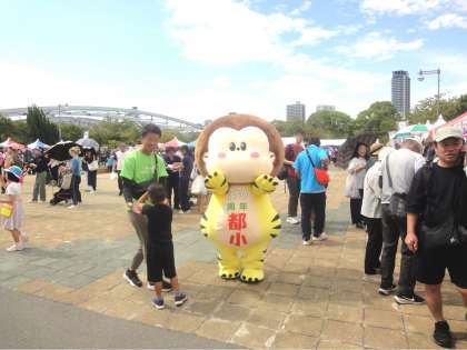 9月27日(土)、大川沿いの毛馬桜ノ宮公園で都島区民まつりが行われました。今年の区民祭りでは、都島小学校創立150周年をPRするため、マスコットキャラクターの「ぬえっしー」が特別に参加し、西都島連合町会のブースの前で活動していました。
