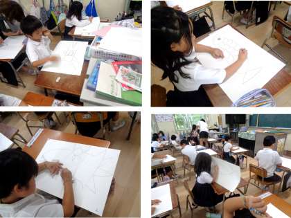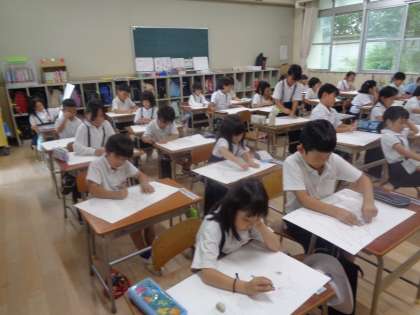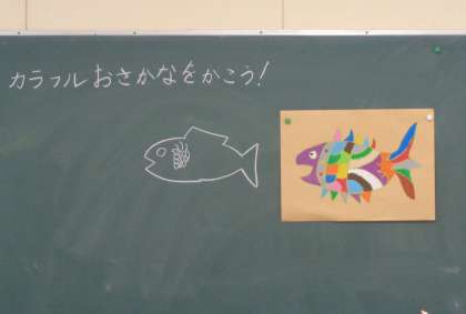 1年生の教室では、図工の学習で「カラフルおさかな」を描いていました。今日は、まだ下描きの段階ですが、できるだけ大きな絵になるように先生からのアドバイスがありました。子どもたちは、うろこなどの部分をどんな色で塗るかを考えながら、個性的なお魚を書いていました。