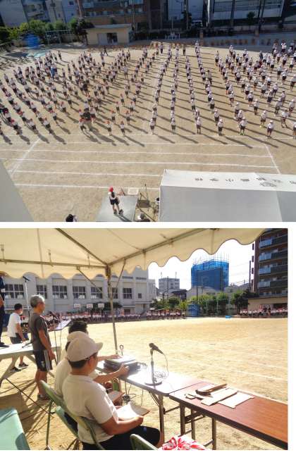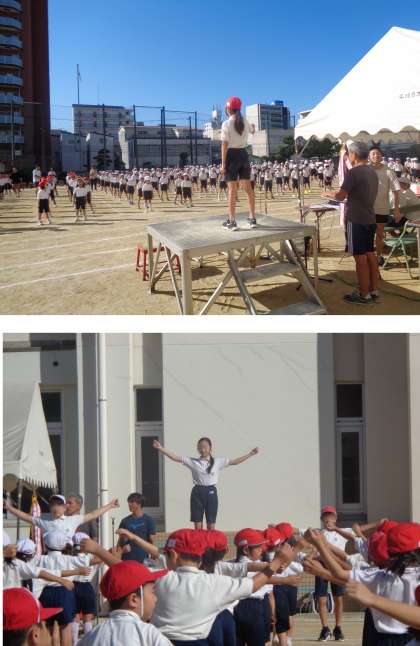 ラジオ体操では、運動委員会の児童が前に出て見本として体操をし、児童代表の言葉や、運動会の歌や校歌を歌うときの指揮は、児童会で決めたそれぞれの役割の児童が取り組みました。