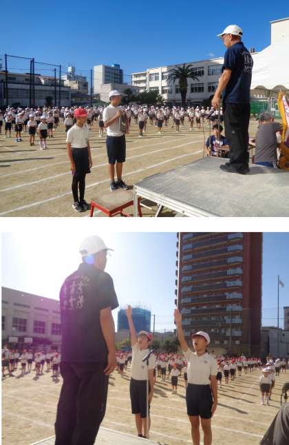 10月17日、今日は初めての運動会全体練習を朝一番から行いました。教室からイスを持ち出し、児童席の場所を確認。その場所から開会式の隊形に移動し、開会式の流れを確認しました。放送は、放送委員会の開会式の役割の児童が行い、応援団長からは、優勝旗・準優勝盾を返還する動きを確かめ合いました。