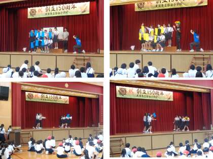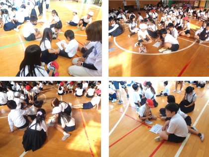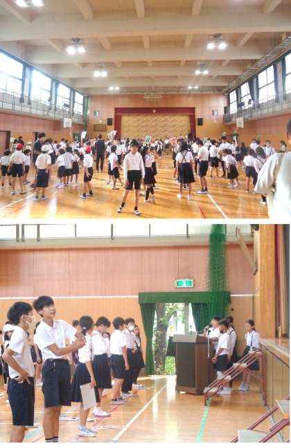 10月20日(月)今日の児童集会は、集会委員会による「まちがいさがし」ゲームです。舞台の上でポーズをとる一団。一度幕が下りて再び幕が開くと、さっきと違っているところがたくさんあります。縦割り班ごとに見つけた「まちがい」をホワイトボードに書いていきます。先生方も登場して、ハロウィンを意識した楽しいポーズでした。