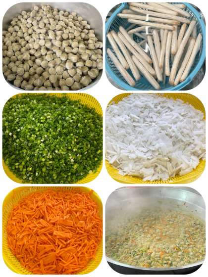 今日の給食では、いわしだんごとだいこん、ごぼう、にんじん、青ねぎなどが入っています。いわしだんごには、骨や歯を丈夫にするカルシウムが含まれています。