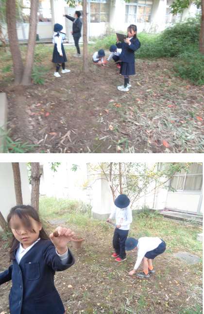 2年生が校内の花や樹木の様子で、秋を感じるものを探しに回っていました。子どもたちは、草が茶色になっていたり、木々が黄色くなっているのを見つけました。また、今年はクヌギの大きなどんぐりがたくさんできていて、拾いながらタブレットで写真を撮っていました。カキの実が色づいていたり、コスモスが花を咲かせていることもしっかりと記録していました。