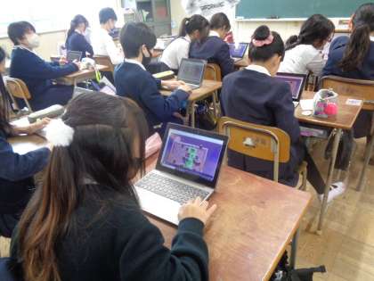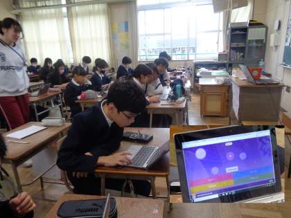 11月6日(木)、6年生の教室では、英語の時間にKafoot!を使って、英単語の学習をしていました。画面にはアルファベットで書かれた単語が現われ、音声でも読み上げます。その単語の日本語訳を4択で選んでいきます。単語の種類は、動物や国の名前などたくさんのカテゴリーがあります。