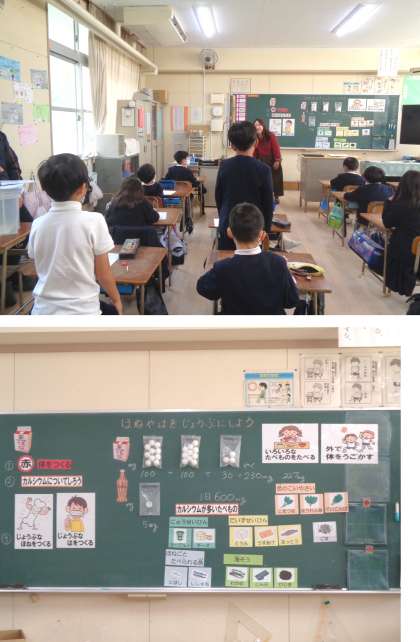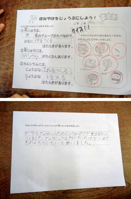 今日の学習は歯や骨を作るカルシウムを多く含んだ食べ物についてです。牛乳や小魚にカルシウムが多いことは子どもたちもよく知っていましたが、小松菜や大豆などにも多く含まれていることや、カルシウムの吸収にはビタミンDが必要なことなど新しい発見がありました。
