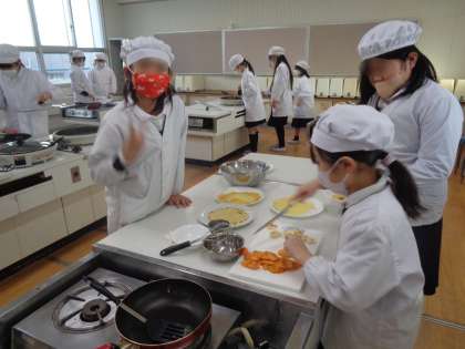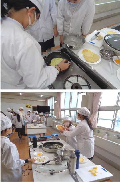 12月4日(木)、6時間目はクラブ活動の時間。いい匂いに誘われて家庭科室をのぞいてみると、料理手芸クラブがクレープを作っていました。ホットプレートに生地を広げて焼いていき、フライ返しでひっくり返します。具は、バナナやカキなどの果物にホイップクリームを添えていきます。