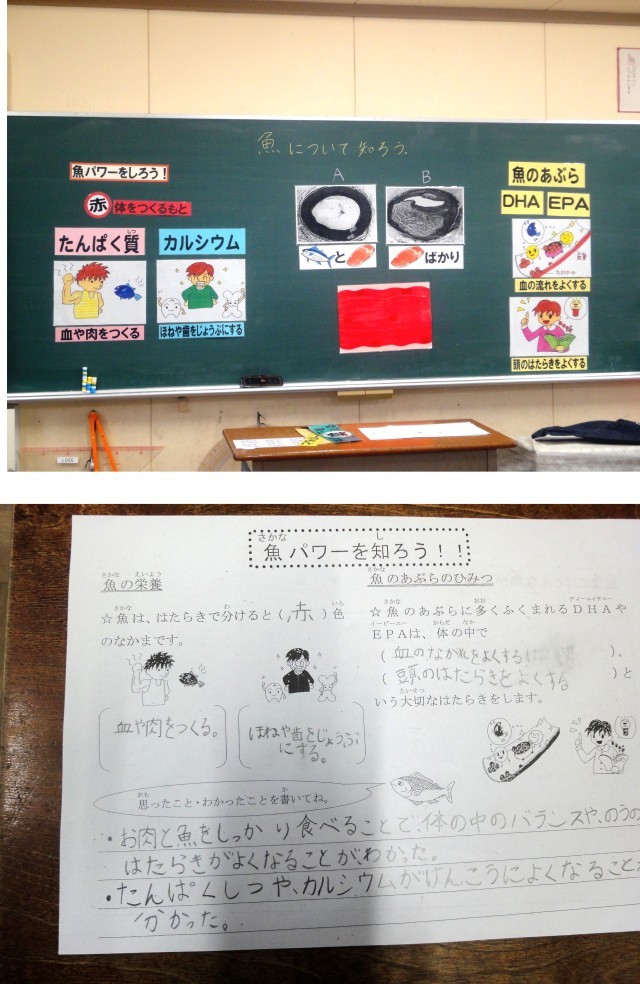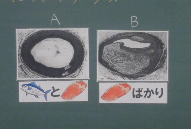 そのあと、魚と肉をバランスよく食べている人と、肉しか食べない人の血管を比べると、後者の血管にはコレストロールがついて血の流れが悪くなることを知りました。学習のまとめでは、「これからは魚をしっかりと食べようと思いました」といった感想が多くありました。